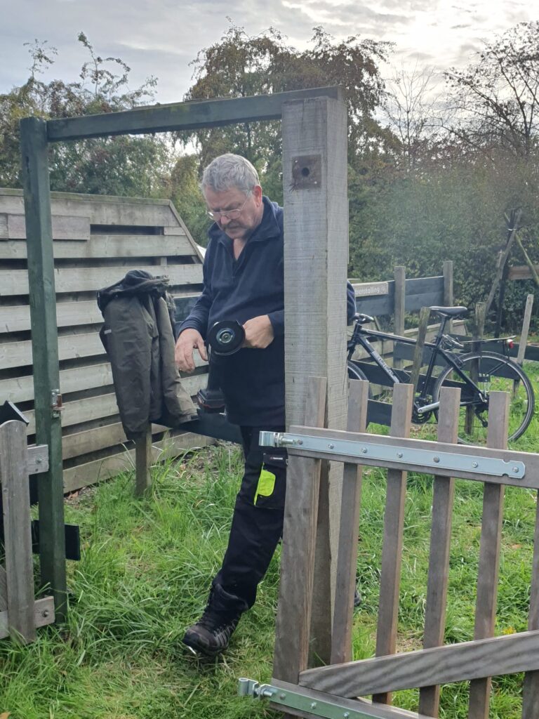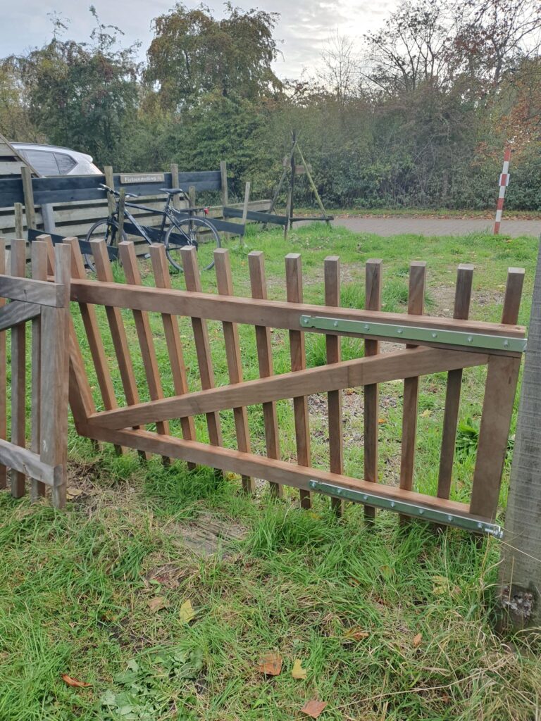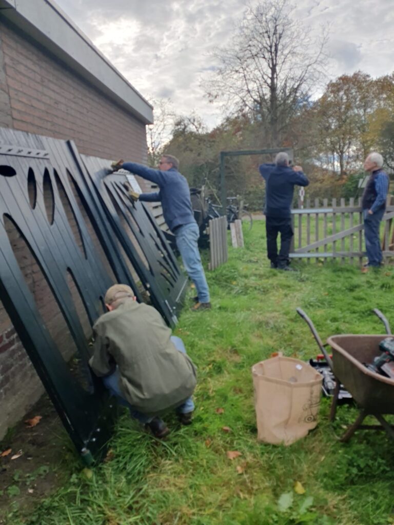 Er wordt hard gewerkt om het hek van de vlinderidylle te vervangen. Hoe mooi ook, het had zijn beste tijd gehad. Morgen krijgt de idylle ook nog een grote opknapbeurt van het hooipeloton en worden braamstruiken ed. gesnoeid.